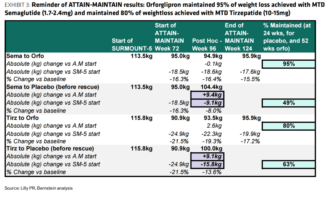 除了空腹限制外,Orforglipron的ATTAIN-1研究在同类减重药物试验中较为特殊,并未强制要求500卡路里的热量缺口(一般纳入此要求的试验,减重效果或将更显著),KOL认为ATTAIN-1研究结果可能更贴近真实世界情况,这将带来处方偏好的差异。