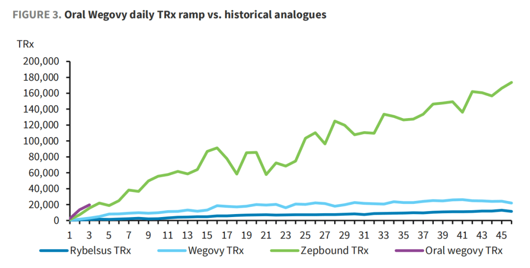 在替尔泊肽实现强劲增长的背景下,市场将更多的焦点放在未来的口服GLP-1市场大战上,口服司美格鲁肽年初在美上市的处方量趋势已经给市场打了个样。